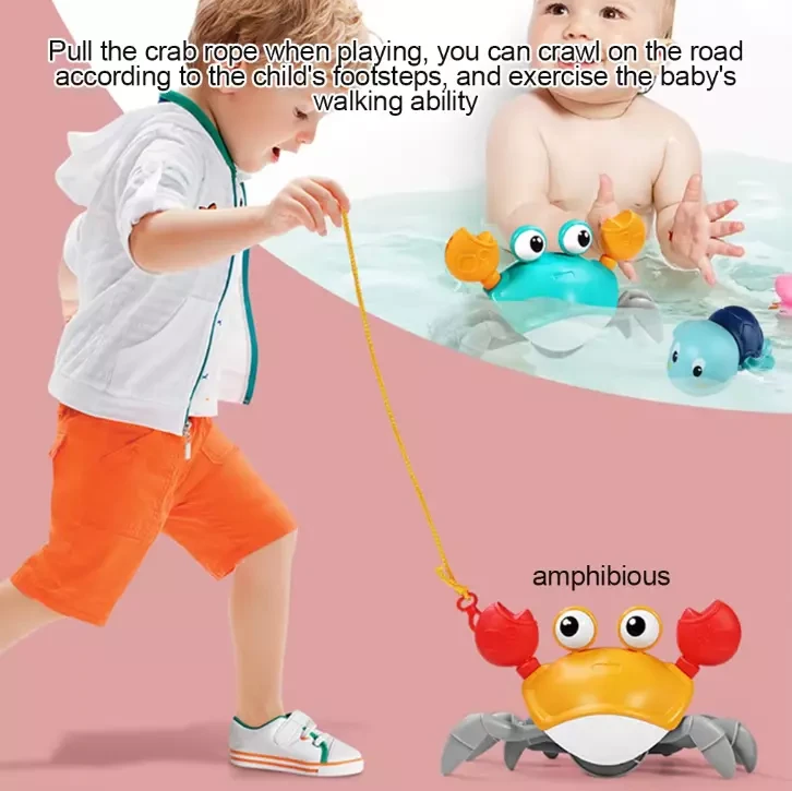 2.This crab toy is designed with clockwork that is convenient for your children to play, the crab could crawl on the ground when pulling the rope, and your baby could follow it to exercise the walking capacity.